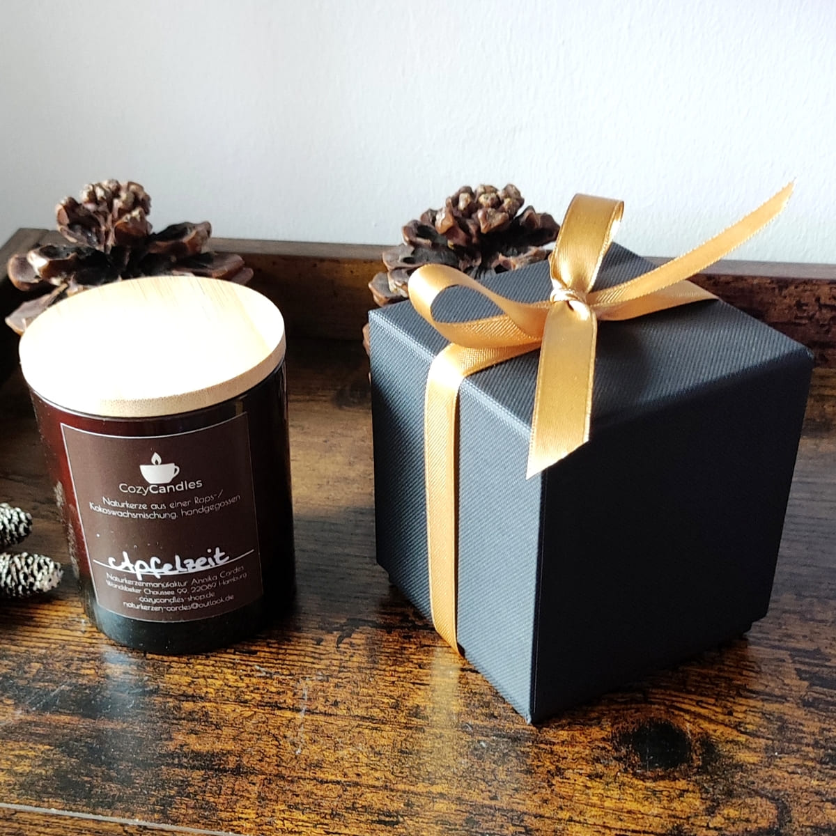 Verwöhne dich mit dieser liebevoll handgemachten Duftkerze aus Raps- und Kokoswachs, die mit ihrem zimtig-süßlichen Apfelduft und dem angenehm knisternden Holzdocht dein Zuhause noch gemütlicher macht.