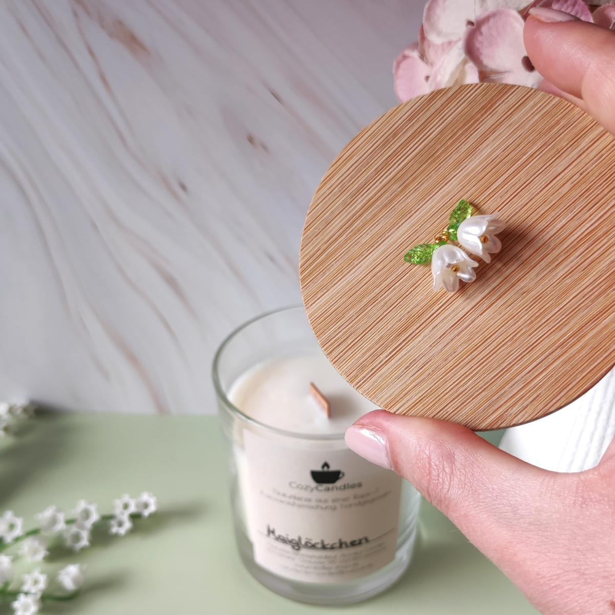 Kerzendeckel: Bambus inkl. 2 Maiglöckchen-Anhängern