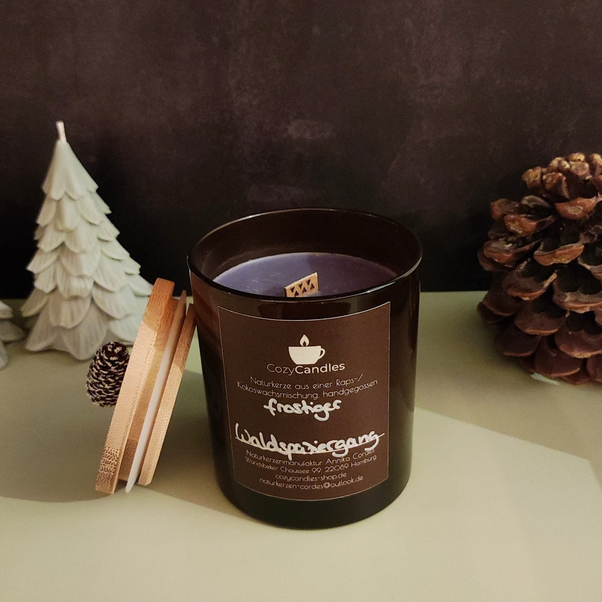 Verwöhne dich mit dieser liebevoll handgemachten Duftkerze aus Raps- und Kokoswachs, die mit ihrem himmlischen Duft und dem angenehm knisternden Holzdocht, dein Zuhause noch gemütlicher macht. Tauche ein in einen erholsamen Waldspaziergang, zu welchem dich Fichte und Tanne mit erfrischenden kühlen und fruchtigen Noten und einer Basis aus Moschus einladen.