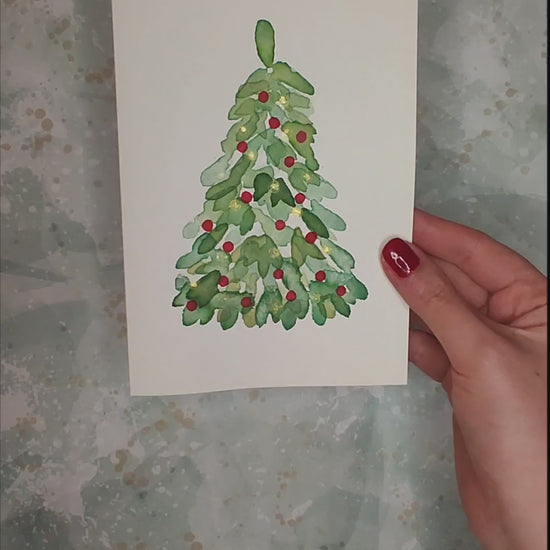 Diese weihnachtliche Grußkarte mit einem handgemalten Weihnachtsbaum ist ein echtes Unikat, ein zweites Mal gibt es sie nicht. Ein majestätischer Tannenbaum, geschmückt mit roten und goldfarbenen Christbaumkugeln, verziert diese hochwertige Grußkarte aus festem Aquarellpapier. Diese Karte wurde ohne Text gestaltet, damit du sie passend zum anstehenden Anlass selbst personalisieren kannst.