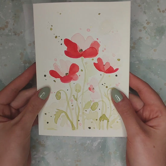 Diese Karte mit roten Blumen ist ein von mir handgemaltes Unikat, ein zweites Mal gibt es sie nicht. Drei wunderschöne Blumen mit roten Blüten verzieren diese hochwertige Karte aus festem Aquarellpapier. In die Blüten wurden dezente goldenen Highlights gesetzt. Diese Karte wurde ohne Text gestaltet, damit du sie passend zum anstehenden Anlass selbst personalisieren kannst.